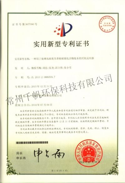 實用新型專利證書 一種用于處理高濃度芳香族硝基化合物廢水的厭氧反應器