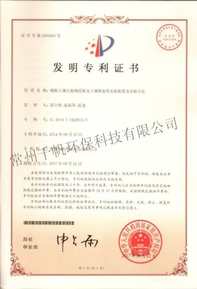 發(fā)明專利證書 模擬土壤污染物遷移及土壤修復的實驗裝置及實驗方法