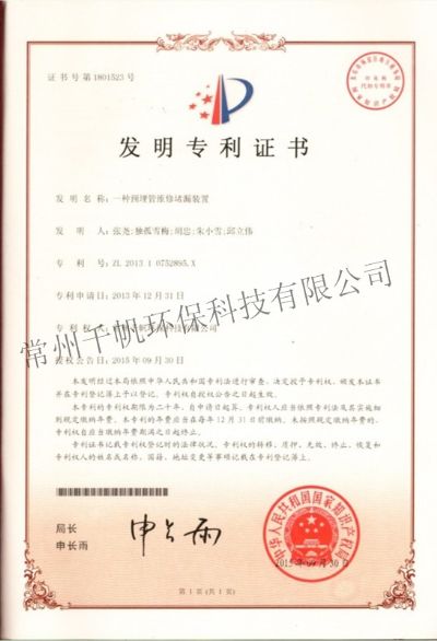 發(fā)明專利證書 一種預埋管維修堵漏裝置