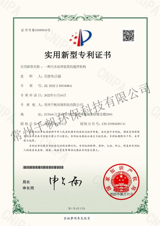 實用新型專利證書 一種污水處理裝置的攪拌機構(gòu)